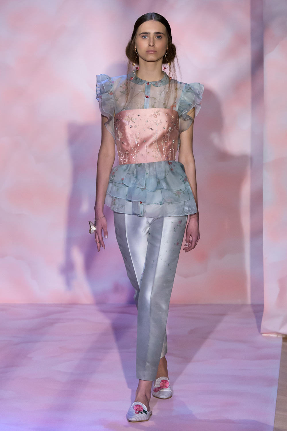 Half angel, half devil, she inhabits imaginary, dream-like woods, experienced in a dimension that transcends real life. Her life is all about dreaming. She is the young inhabitant of the Gattinoni world, a fearless, unrestrained adolescent, she lives with carefree verve, sacrilegious exuberance. Her key weapon are dreams. A stark contrast of severe, voluminous and soft lines. Braids, crosses and triangles take shape in embroidery and in working techniques, like sacred reminders of knowledge that has been lost and then rediscovered. For the forthcoming spring/summer season, Guillermo Mariotto, creative director of maison Gattinoni, re-imagines Shakespeare’s “A Midsummer Night’s Dream”, in a phantasmagorical contemporary garden. A colou red Eden, where haute couture merges with reality, the dream-like kingdom of young adolescents.“My woman mysteriously reverts to adolescence - explains Mariotto - She experiences a reincarnation and a new youth. A more liberated, carefree existence like contemporary couture which relinquishes heels but not the typical rituals of haute couture. Sartorial hyperbole”.Dresses, at times surreal, are inspired by a physical, transcendent sleepy, dream-like state. Like a painting by Pablo Picasso, in this dream-like world, faces are distorted with embroidered veils that transform and fragment the face. Mariotto transforms classic striped pyjamas into silk organza haute couture masterpieces featuring four thousand eight hundred matelassé smock stitches. Gattinoni’s designer draws inspiration from clouds, reproducing their fluffiness and volume with haute couture techniques, creating warps and wefts, based on a sophisticated research of the ancient techniques of smocking, especially those used in Italy, Britain and North America. Over-sized organza shirts, featuring matelassè - effect dickeys borrowed from the male wardrobe are paired with skirts featuring severe pleats joined by small, origami-inspired fabric bows. “My aim, when designing this collection was to play with colours - explainsMariotto - All the nuances of pink, powder blue, sage green, pearl grey, raspberry, white and black. Comforting, reassuring shades that enfold, cover, drape and embody my fantasies”. Like a painting by Pierre Auguste Renoir. Hence the appearance of flights of brightly-coloured butterflies and dragonflies on maxi T-shirts that become mini-dresses. Hand-painted charmeuse kaftans describe a terrestrial paradise filled with roses, jasmine and poppies, almost a regenerated form nature. Dresses resembling dressing gowns in powder blue, illuminated with crystals and mother-of-pearl, plays of applications, details and pleats. Silk tulle and silky organza are the materials chosen for long dresses that tell the story of the constellations, a blaze of tiny, star-shaped transparent crystals. Large intricately worked collars caress the faces of young women in an atmosphere reminiscent of an eternal toy land, where time is marked by the chiming of musical boxes. However, dreams are not always about fairytales. Hence, the clouds of light tulle begin to darken, like the small leather jacket embellished with cock, ostrich and partridge feathers worn over culottes, a tribute to pop star Beyoncé, a contemporary goddess who is a fan of the Gattinoni look.